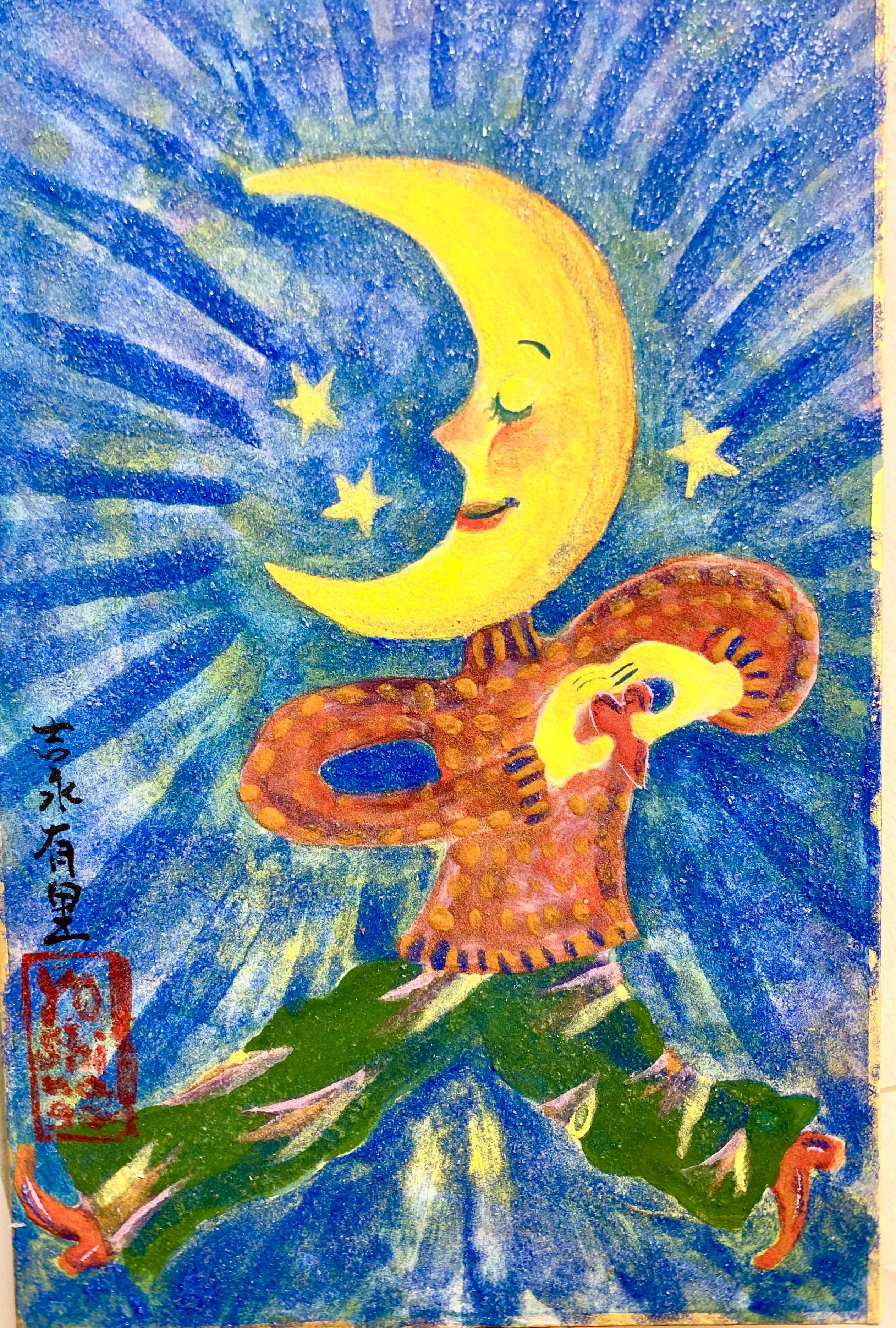 人気のお月様シリーズ、贅沢に岩絵具・群青と雲母を使用して天然のキラキラ光る美しさがあります。小さな作品ですが、厚みのある額縁で床置きも可能です。