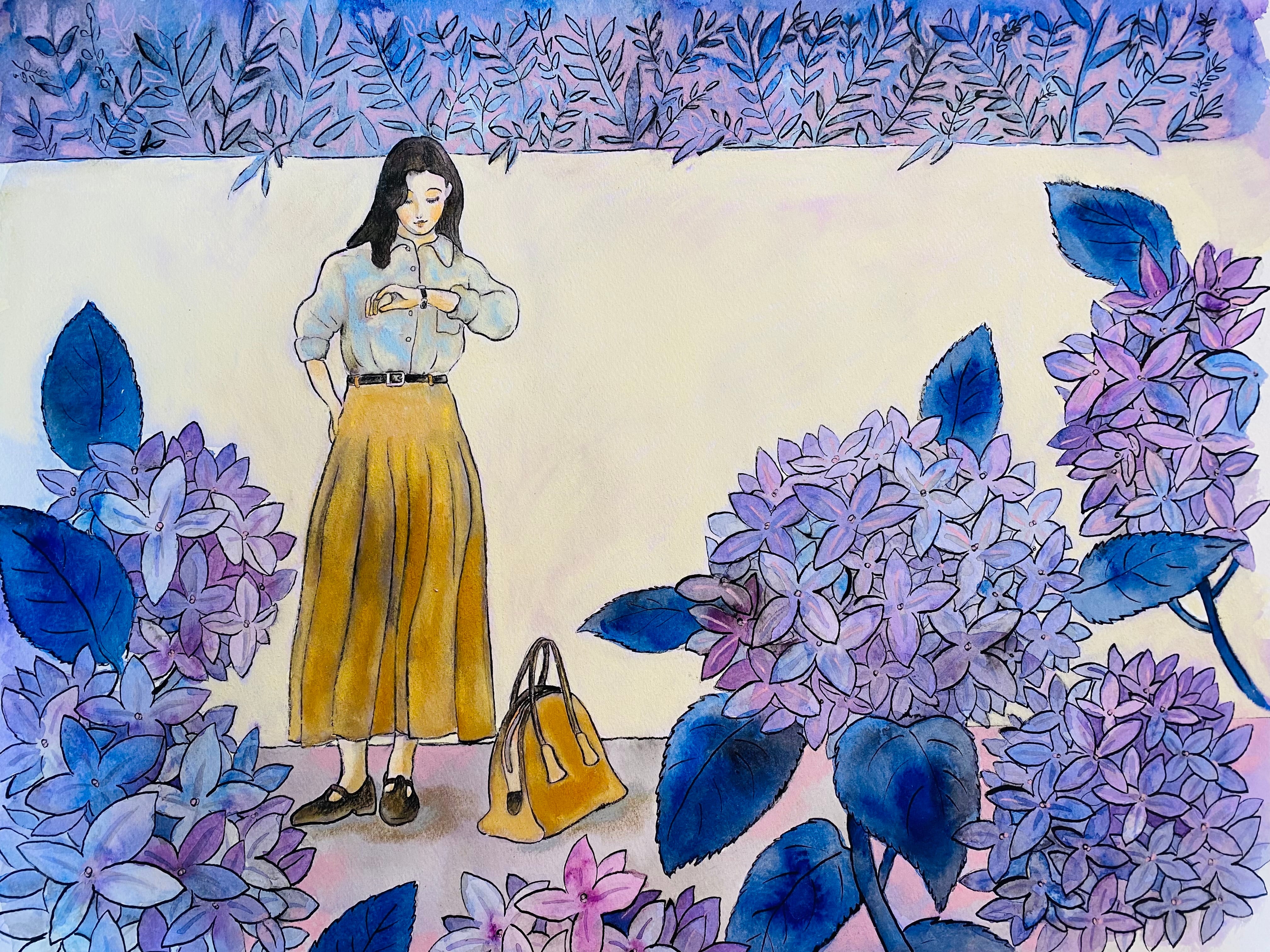 〈絵画〉吉永有里 「紫陽花園にて」葦ペン・パステル原画